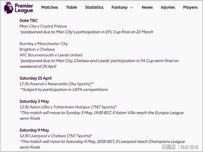 从官方的时间表来看,除了曼城面对水晶宫的比赛之外,因为足总杯半决赛和英超第34轮重合,曼城客场挑战伯恩利,切尔西客场挑战布莱顿,以及利兹联客场挑战伯恩茅斯,这三场比赛也被标上TBC的符号,意味着已经确定改期,只是具体的时间,还需要等待协调落实。
